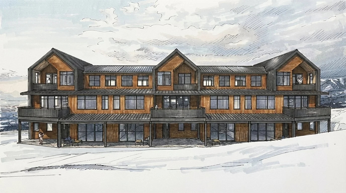 Commissioned as a conceptual design for a seven-unit ski-in/ski-out townhome development at the base of Powderhorn Ski Area. This project explores an elevated architectural response within a resort context largely unchanged since the 1970s and 1980s. Positioned just steps from the chairlift, the site offers immediate access to the slopes alongside expansive alpine views.